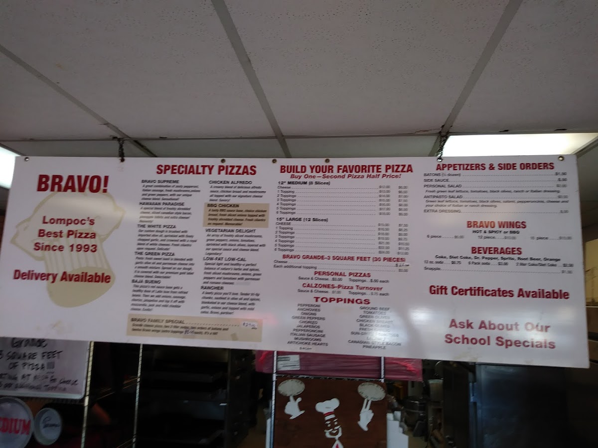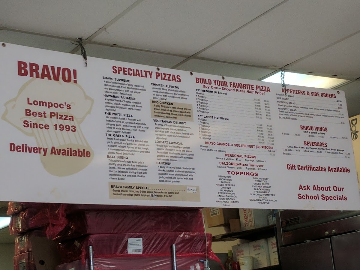Bravo Pizza in Lompoc offers a delightful and varied pizza menu, perfect for satisfying all taste preferences. Whether you're in the mood for something classic or adventurous, this menu provides a wide range of options in different sizes to suit any appetite.