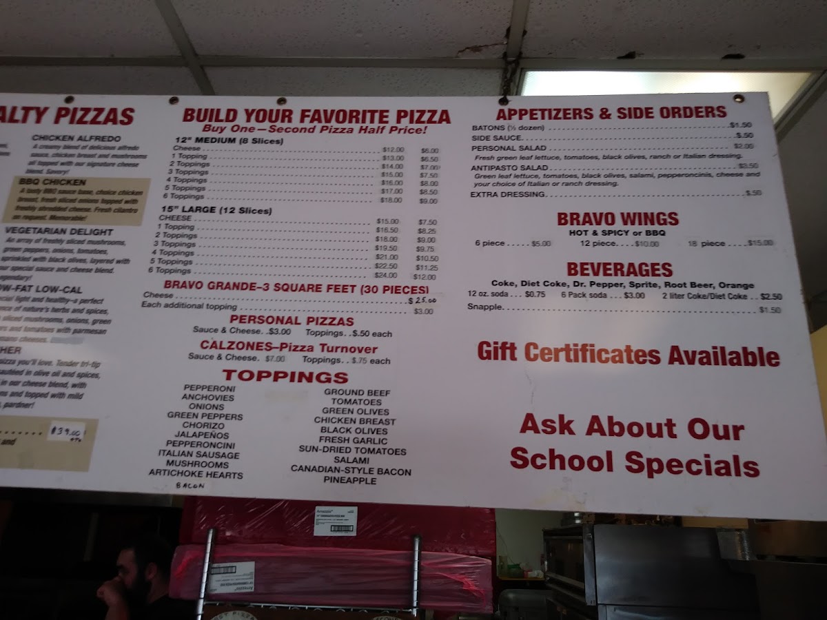 With this wide selection, Bravo Pizza ensures that there's something for everyone, whether you're a fan of classic cheese or prefer something more adventurous. The pizza sizes cater to all group sizes, from individuals to large gatherings, offering an experience that is both delicious and versatile.